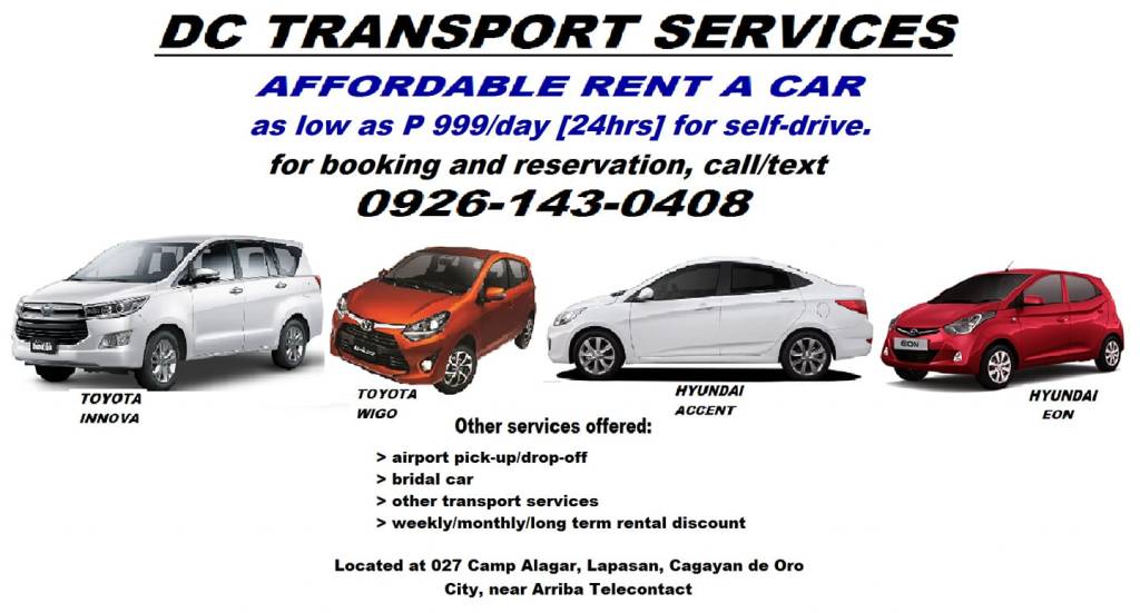 Affordable Car Rental and Transportation Services situated in 027 Camp Alagar, Barangay Lapasan, Cagayan de Oro. Services: Airport Pick-up and Drop-off, Bridal Car Services, Comprehensive Transportation Solutions – Discounted Rates for Weekly, Monthly, and Long-term Rentals.